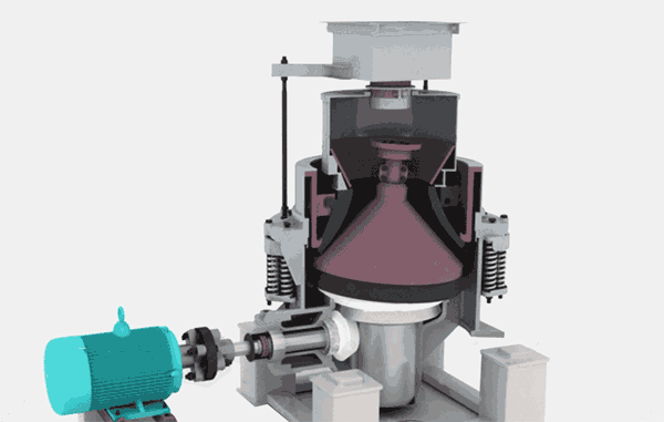 破碎機(jī)的工作過程中,電動機(jī)通過傳動裝置帶動偏心套旋轉(zhuǎn),動錐在偏心軸套的迫動下做旋轉(zhuǎn)擺動,動錐靠近靜錐的區(qū)段即成為破碎腔,物料受到動錐和靜錐的多次擠壓和撞擊而破碎。動錐離開該區(qū)段時(shí),該處已破碎至要求粒度的物料在自身重力作用下下落,從錐底排出。
