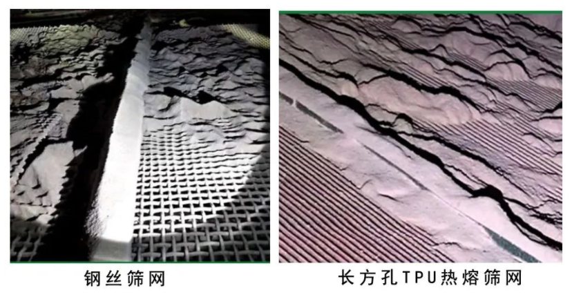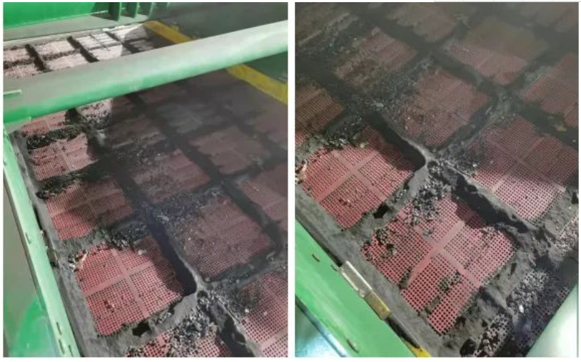 改為長方孔TPU熱熔篩網(wǎng)篩分,仍存在堵孔情況,無法解決干法篩分難題。
