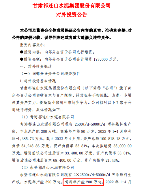 (1)青海祁連山水泥有限公司:青海祁連山水泥有限公司現(xiàn)有2500t/d+5000t/d兩條熟料生產(chǎn)線,年水泥產(chǎn)能380萬噸,商砼年產(chǎn)能80萬方,2022年1-4月凈利潤-1,385.73萬元,截止2022年4月底,資產(chǎn)總額100,818.18萬元,負(fù)債54,248.86萬元,資產(chǎn)負(fù)債率53.81%。本次擬增資35,000.00萬元。增資前該公司注冊資本33,400.00萬元,資產(chǎn)負(fù)債率53.81%,增資后該公司注冊資本68,400.00萬元,資產(chǎn)負(fù)債率21.43%。