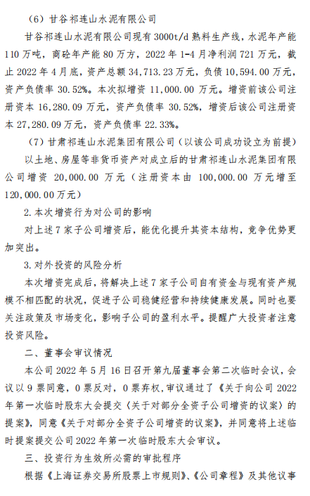 (6)甘谷祁連山水泥有限公司:甘谷祁連山水泥有限公司現(xiàn)有3000t/d熟料生產(chǎn)線,水泥年產(chǎn)能110萬噸,商砼年產(chǎn)能80萬方,2022年1-4月凈利潤721萬元,截止2022年4月底,資產(chǎn)總額34,713.23萬元,負(fù)債10,594.00萬元,資產(chǎn)負(fù)債率30.52%。本次擬增資11,000.00萬元。增資前該公司注冊資本16,280.09萬元,資產(chǎn)負(fù)債率30.52%,增資后該公司注冊資本27,280.09萬元,資產(chǎn)負(fù)債率22.33%。