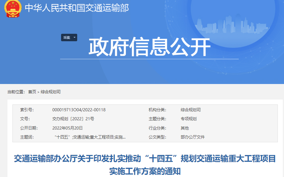 關(guān)于扎實推動“十四五”規(guī)劃交通運輸重大工程項目實施的工作方案重大工程項目是加快“十四五”交通運輸發(fā)展規(guī)劃落地實施的有力抓手和重要支撐,對于推進(jìn)“十四五”交通運輸開好局、起好步具有重要引領(lǐng)作用。為深入貫徹黨中央、國務(wù)院關(guān)于加快推進(jìn)“十四五”規(guī)劃重大工程項目建設(shè)的決策部署,扎實推動“十四五”規(guī)劃交通運輸重大工程項目實施,特制定本方案。
