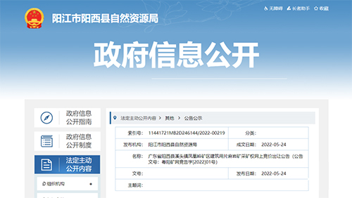 5月24日,廣東省陽江市陽西縣自然資源局發(fā)布廣東省陽西縣溪頭鎮(zhèn)鳳凰嶺礦區(qū)建筑用片麻巖礦采礦權網(wǎng)上競價出讓公告,資源儲量超9000萬立方米,設計生產(chǎn)規(guī)模1120萬立方米/年,出讓起始價10億元。