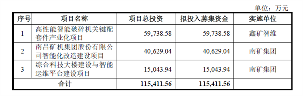 破碎機(jī)關(guān)鍵配套件產(chǎn)業(yè)化項(xiàng)目,總投資59738.58 萬(wàn)元;南昌礦機(jī)集團(tuán)股份有限公司智能化改造建設(shè)項(xiàng)目,總投資40629.04 萬(wàn)元;綜合科技大樓建設(shè)與智能運(yùn)維平臺(tái)建設(shè)項(xiàng)目,總投資15043.94萬(wàn)元,合計(jì)總投資約11.54億元。