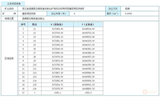6月2日,遂昌縣自然資源和規(guī)劃局發(fā)布公告,掛牌出讓一宗建筑用花崗巖礦,擬出讓4年(含1年基建期),起始價(jià)2億元。