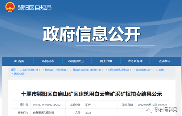 6月10日,湖北十堰市鄖陽區(qū)自然資源規(guī)劃局發(fā)布十堰市鄖陽區(qū)白廟山礦區(qū)建筑用白云巖礦采礦權拍賣結果公示,資源儲量超1億噸,年產800萬噸,出讓15年,十堰金盈礦業(yè)有限公司1.11億元競得該礦權。