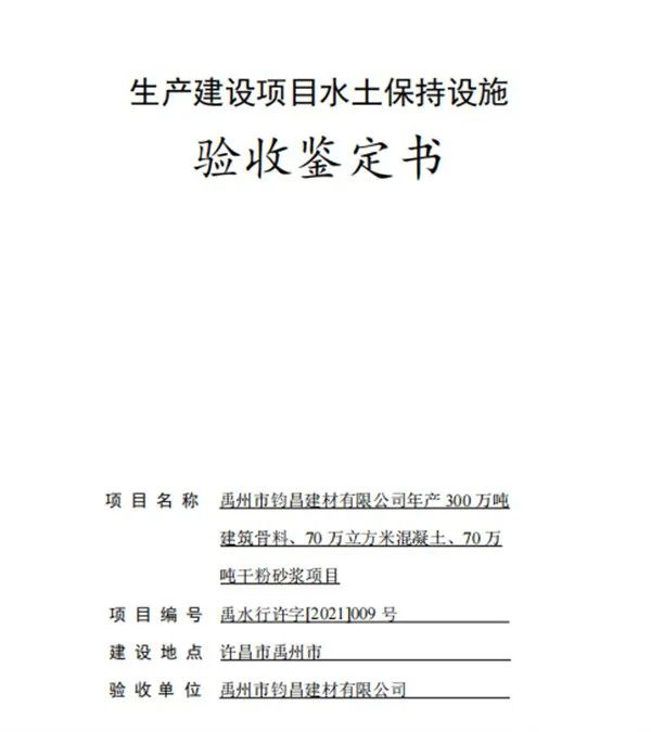近日,禹州市鈞昌建材有限公司主持召開了“禹州市鈞昌建材有限公司年產(chǎn)300萬噸建筑骨料、70萬立方米混凝土、70萬噸干粉砂漿項(xiàng)目水土保持設(shè)施驗(yàn)收會(huì)”。參加會(huì)議的有水土保持方案報(bào)告編制單位、水土保持設(shè)施驗(yàn)收?qǐng)?bào)告編制單位、水土保持監(jiān)測、監(jiān)理單位以及水土保持施工單位的代表及特邀專家,會(huì)議成立了驗(yàn)收組。
