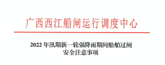 根據(jù)氣象部門預(yù)測,6月17-21日,廣西區(qū)有持續(xù)性大范圍暴雨天氣過程,部分地區(qū)有大暴雨、局部特大暴雨,過程累計雨量大部100~200毫米,部分地區(qū)250~400毫米,局部600毫米以上。目前廣西區(qū)江河水庫水位高,土壤含水量大,新一輪暴雨過程暴雨落區(qū)與前期高度重疊,西江將迎來流域性特大洪水。為保障汛期過閘船舶、船閘和樞紐安全,嚴(yán)防水上險情事故發(fā)生,結(jié)合西江流域汛期特點,請廣大過閘船舶船員注意以下事項: