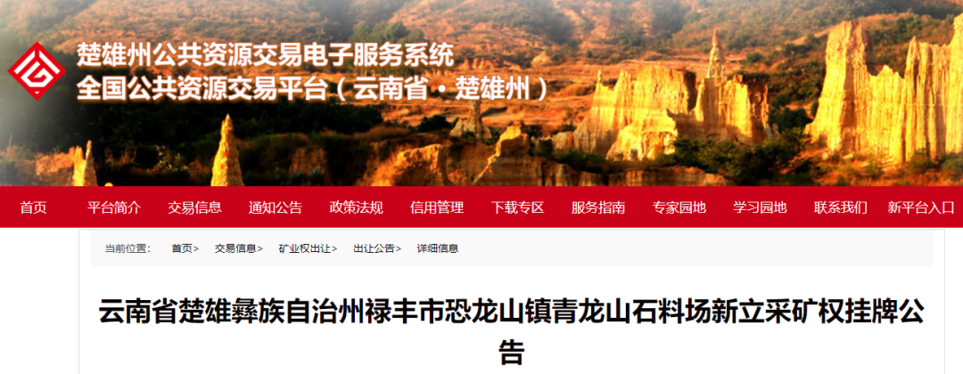 云南省楚雄彝族自治州祿豐市恐龍山鎮(zhèn)青龍山石料場(chǎng)新立采礦權(quán)掛牌公告根據(jù)《中華人民共和國(guó)礦產(chǎn)資源法》、《探礦權(quán)采礦權(quán)招標(biāo)拍賣掛牌管理辦法(試行)》(國(guó)土資發(fā)〔2003〕197號(hào))和《礦業(yè)權(quán)交易規(guī)則》(國(guó)土資規(guī)〔2017〕7號(hào))、《云南省自然資源廳關(guān)于貫徹落實(shí)自然資源部推進(jìn)礦產(chǎn)資源管理改革若干事項(xiàng)的實(shí)施意見(試行)》(云自然資規(guī)〔2020〕2號(hào))的規(guī)定,經(jīng)楚雄州人民政府批準(zhǔn),現(xiàn)以掛牌方式公開出讓祿豐市恐龍山鎮(zhèn)青龍山石料場(chǎng)采礦權(quán),現(xiàn)將有關(guān)事項(xiàng)公告如下: