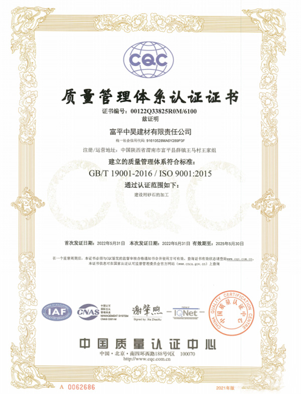 近日,經(jīng)中國(guó)檢驗(yàn)認(rèn)證中心專家組實(shí)地嚴(yán)格審驗(yàn),陜煤新材集團(tuán)富平公司建立的質(zhì)量管理體系符合標(biāo)準(zhǔn):GB/T 19001-2016/ISO 9001:2015 ,順利通過質(zhì)量管理體系認(rèn)證,標(biāo)志著富平公司已具備科學(xué)穩(wěn)定的質(zhì)量管理能力,能夠?yàn)榭蛻籼峁┮涣鞯?a href='http://m.chezhuml.cn/' target='_blank'>砂石骨料產(chǎn)品,為踐行陜煤新材集團(tuán)“精耕細(xì)作,技藝精湛”質(zhì)量理念提供了有力支撐。