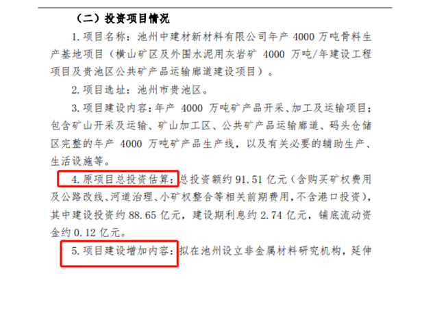 據(jù)介紹,原投資中,涉及含購買礦權(quán)費用及公路改線、河道治理、小礦權(quán)整合等相關(guān)前期費用,不含港口投資。現(xiàn)增加了擬在池州設(shè)立非金屬材料研究機構(gòu),延伸產(chǎn)業(yè)鏈,并在池州市相關(guān)園區(qū)建設(shè)現(xiàn)代裝備制造產(chǎn)業(yè)、高技術(shù)產(chǎn)業(yè)及高端裝配式建筑產(chǎn)業(yè)。調(diào)整后項目建設(shè)投資約102.67億元,建設(shè)期利息約3.31億元,鋪底流動資金約0.15億元,資金來源為企業(yè)自有及自籌。