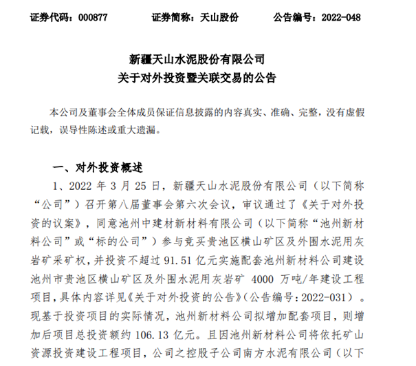 早在今年3月25日,天山股份首次披露的對外投資議案中顯示,公司同意池州中建材新材料有限公司(下稱池州新材料)參與競買貴池區(qū)橫山礦區(qū)及外圍水泥用灰?guī)r礦采礦權(quán),并投資不超過91.51億元實施配套建設(shè)年產(chǎn)4000萬噸骨料生產(chǎn)基地項目。