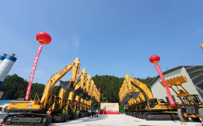 驕陽似火,流金鑠石,施工現(xiàn)場熱火朝天,爭分奪秒。7月15日,江西某工地舉辦了盛大交機(jī)儀式,山東臨工33臺大中型挖掘機(jī)、裝載機(jī)、壓路機(jī)等設(shè)備分列兩側(cè),如同出征的將士,即將奔赴遂大高速公路施工現(xiàn)場,助力國家重點(diǎn)工程建設(shè),在新的戰(zhàn)場展示山東臨工“城市交通建設(shè)綜合解決方案”的風(fēng)采。中鐵十一局、中鐵十二局、中鐵二十一局、山東臨工、江西榮通路橋、江西臨沃等公司相關(guān)領(lǐng)導(dǎo)共同出席見證。