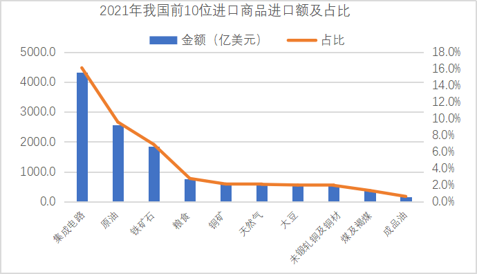據(jù)統(tǒng)計,2021年,我國進口額排名前三位的商品中,芯片進口額高達6354.8億美元,占全部進口總額的16.10%;原油進口額2573.3億美元,占進口總額的9.58%;鐵礦石進口額1846.7億美元,占進口總額的6.87%。這三大商品進口額均超過1500億美元,遠高于其他商品。