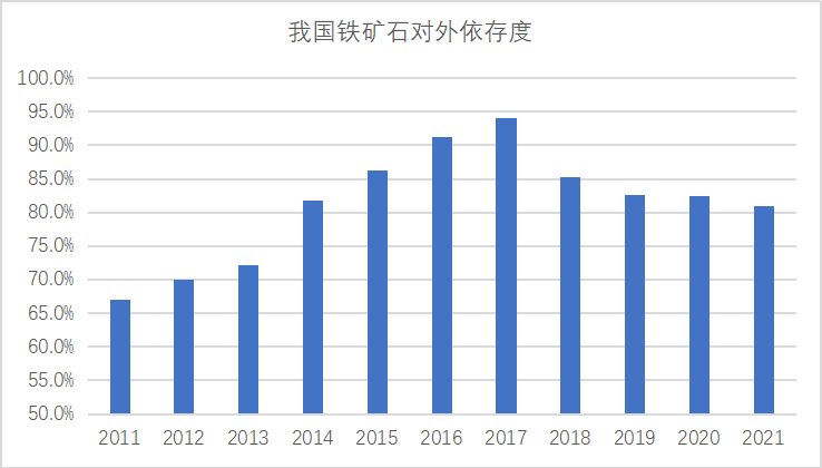 2012年-2021年10年間,我國鐵礦石進口總量高達99.7億噸,共消耗外匯9676億美元(折合人民幣6.2萬億元),10年間鐵礦石進口均價達到97.0美元/噸。10年間我國進口鐵礦石所消耗外匯相當于2021年土耳其全國的GDP(國民生產(chǎn)總值)。從對外依存度來看,自2014年我國鐵礦石對外依存度(不考慮庫存變化)首次超過80%以后,鐵礦石對外依存度居高不下,再無低于80%的年份,2016年、2017年甚至超過90%以上。
