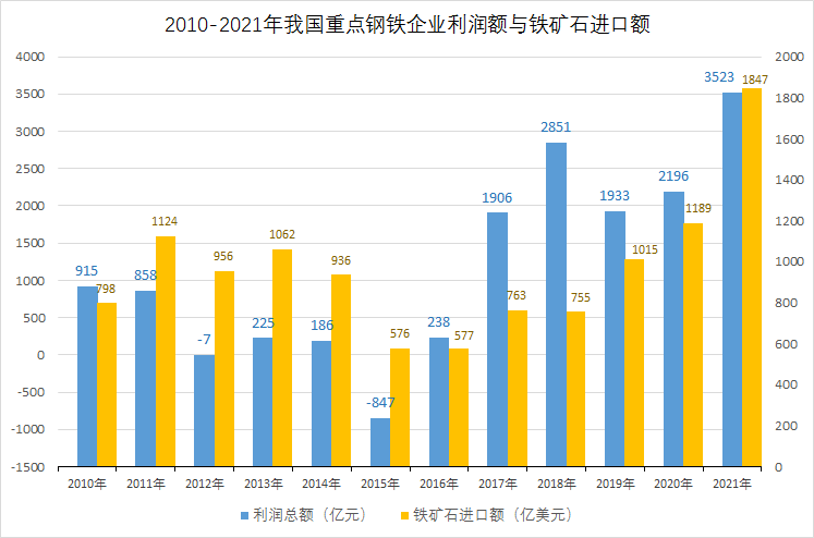 若以近10年的鐵礦石進口均價為基礎來計算近2年我國鐵礦石進口超額花費的話,相當于2021年我國因鐵礦石價格上漲多花費753.67億美元,折合人民幣4785.8億元。按照我國重點鋼鐵企業(yè)利潤總額3523.9億元計算,相當于我國重點鋼鐵企業(yè)利潤總額的1.35倍。2021年,我國鋼鐵企業(yè)銷售利潤率也僅有5.08%。