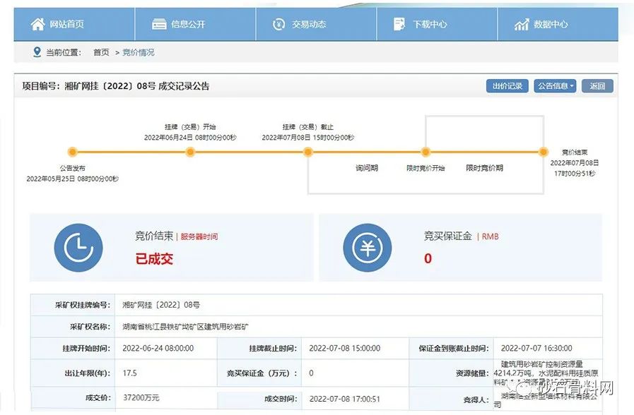 該礦區(qū)位于湖南省益陽市桃江縣灰山港鎮(zhèn),礦區(qū)面積0.3495平方千米,準采標高300米至145米;開采礦種建筑用砂巖,礦區(qū)內(nèi)建筑用砂巖礦控制資源量4040.4萬噸,水泥配料用硅質(zhì)原料礦控制資源量215.8萬噸;生產(chǎn)規(guī)模建筑用砂巖礦230萬噸/年,水泥配料用硅質(zhì)料礦10萬噸/年;出讓年限17.5年(礦山服務年限加1年基建期)。根據(jù)公告,競得人除繳納出讓收益外,另需一次性支付桃江縣人民政府凈礦出讓成本價格2841萬元。湖南臨亞新型墻體材料有限公司最終以3.72億元再次競得該采礦權(quán)。