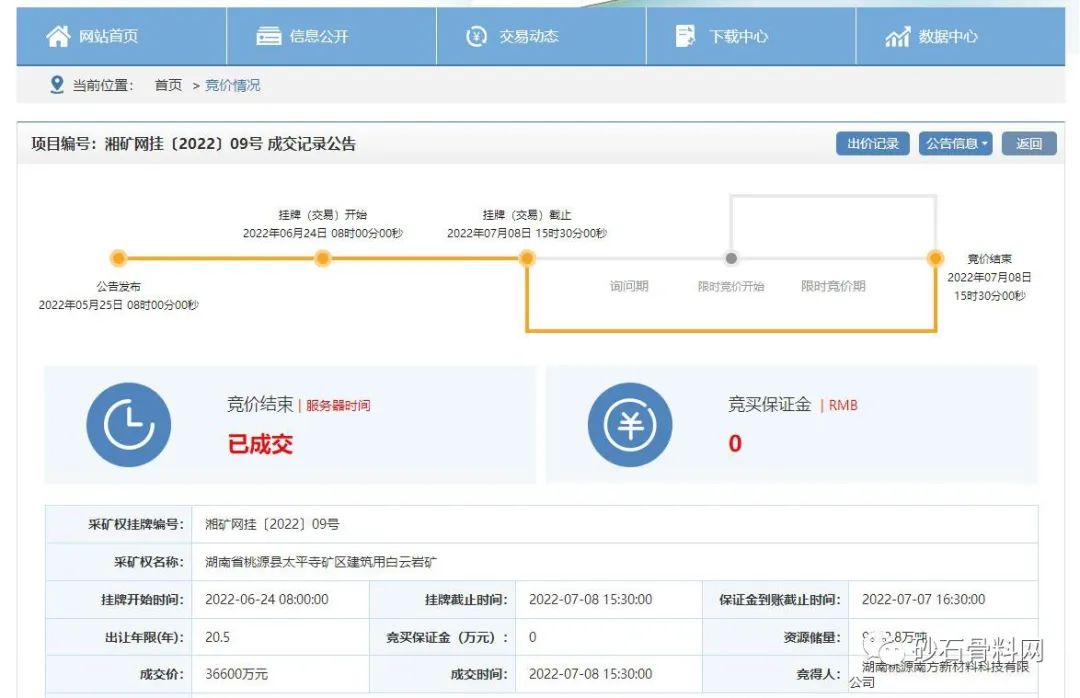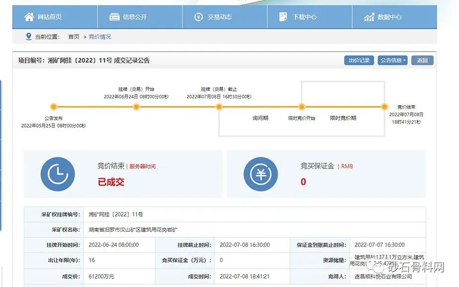 該礦區(qū)位于湖南省岳陽市汨羅市弼時鎮(zhèn),礦區(qū)面積0.3144平方千米,準采標高266米至100米;開采礦種建筑用花崗巖,建筑用砂控制資源量1373.1萬立方米(含砂率63.7%,礦石量3158.13萬噸)、建筑用花崗巖(碎石)控制資源量1785.4萬噸;生產(chǎn)規(guī)模建筑用砂100萬立方米/年(230萬噸/年),建筑用花崗巖(碎石)100萬噸/年,出讓年限16年(礦山服務年限加1年基建期)。根據(jù)公告,競得人還需一次性繳納汨羅市人民政府凈礦出讓成本13419萬元。遂昌順科悅石業(yè)有限公司最終以6.12億元成功競得該采礦權(quán)。
