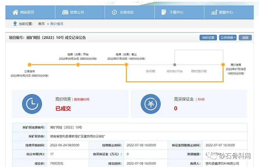 制砂生產(chǎn)線、排土場、礦山公路等配套設施土地租賃、征收等相關(guān)費用)。慈利縣鑫源石料有限公司最終以7900萬元成功競得該采礦權(quán)。