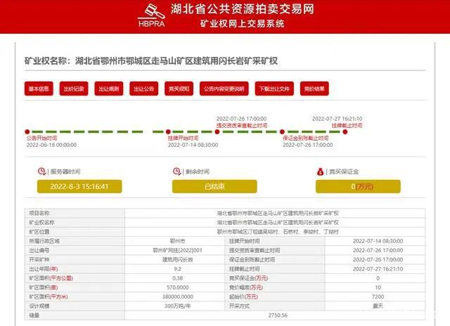 近期,湖北省公共資源拍賣交易網(wǎng)礦業(yè)權(quán)網(wǎng)上交易系統(tǒng)發(fā)布湖北省鄂州市鄂城區(qū)走馬山礦區(qū)建筑用閃長巖礦和湖北省陽新縣仙牛山礦區(qū)建筑石料用白云巖礦兩宗采礦權(quán)成交結(jié)果公告。兩個(gè)礦權(quán)儲量近1.5億噸,生產(chǎn)規(guī)模共計(jì)800萬噸/年,成交價(jià)超4億。