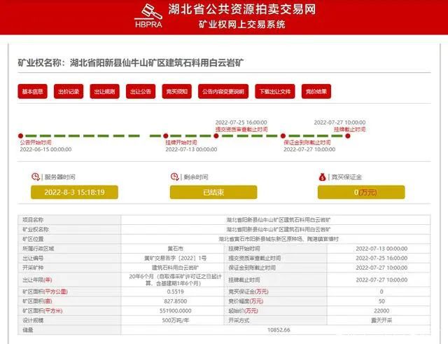 1、湖北省陽新縣仙牛山礦區(qū)建筑石料用白云巖礦采礦權(quán):資源量10852.66萬噸,生產(chǎn)規(guī)模500萬噸/年,成交價(jià)2.2億元。競得人—湖北仙牛山綠色建筑材料有限公司。