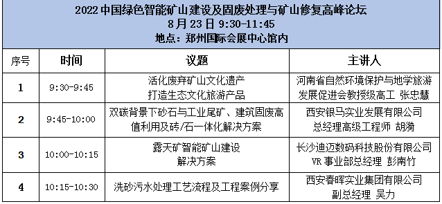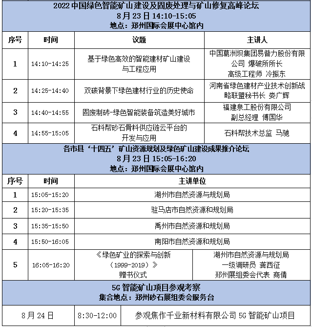 本屆展會(huì)期間,除了有豐富的主題演講活動(dòng),為了展現(xiàn)各地綠色智能化礦山建設(shè)和生態(tài)修復(fù)成果,同期將舉行“各市縣‘十四五’礦山資源規(guī)劃及綠色礦山建設(shè)成果推介論壇”、焦作千業(yè)新材料有限公司5G智能礦山項(xiàng)目參觀考察活動(dòng)。