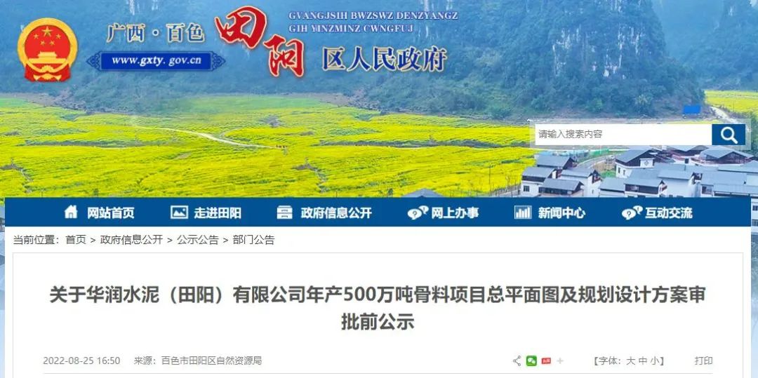 近日,華潤水泥(田陽)有限公司年產(chǎn)500萬噸骨料項目總平面圖及規(guī)劃設(shè)計方案進行批前公示。