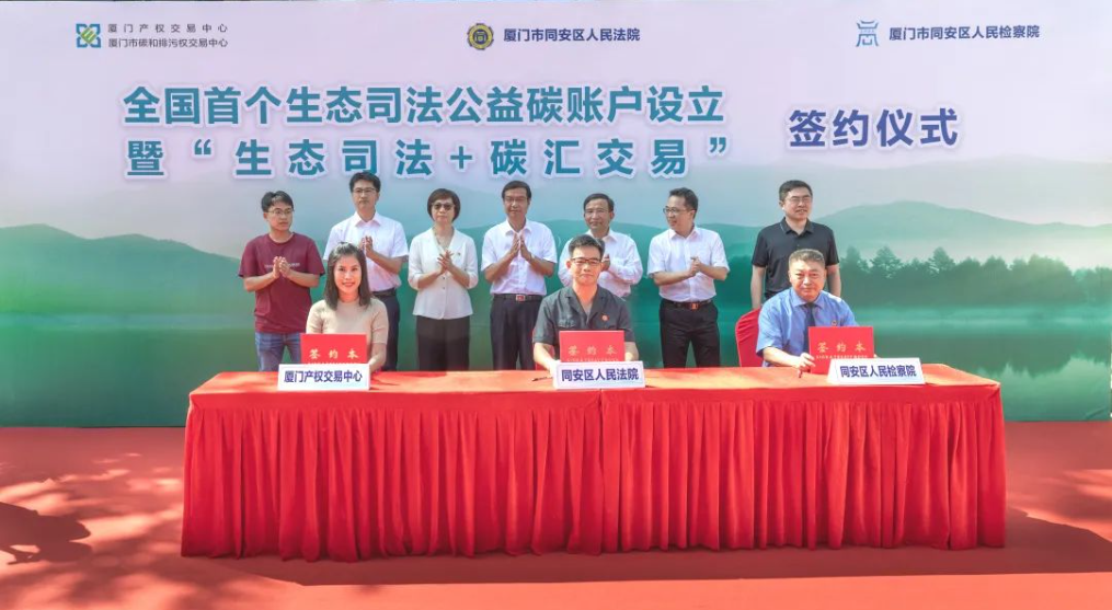 8月30日,全國(guó)首個(gè)生態(tài)司法公益碳賬戶設(shè)立暨“生態(tài)司法+碳匯交易”簽約儀式在廈門舉行。廈門市同安區(qū)人民法院、廈門市同安區(qū)人民檢察院與廈門產(chǎn)權(quán)交易中心(廈門市碳和排污權(quán)交易中心)開(kāi)展合作,依托廈門產(chǎn)權(quán)交易中心設(shè)立的全國(guó)首個(gè)農(nóng)業(yè)碳匯交易平臺(tái)和全國(guó)首個(gè)海洋碳匯交易平臺(tái),打造生態(tài)司法和碳匯交易平臺(tái)之間的直通機(jī)制,建立“藍(lán)碳+綠碳”的“雙碳”生態(tài)司法修復(fù)模式。