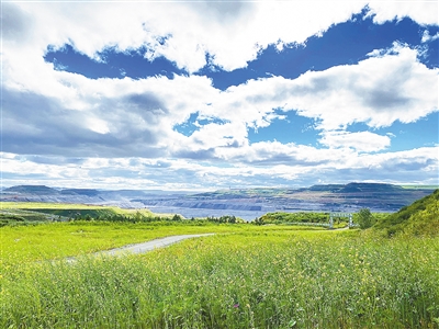 礦瞭望臺(tái)遠(yuǎn)眺,除煤礦作業(yè)區(qū)外,盡收眼底的是一片綠色,沙打旺、紫花苜蓿、小葉錦雞兒等植被在雨后顯得更加郁郁蔥蔥。