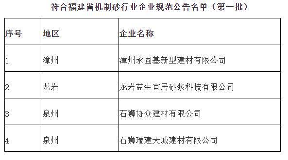 根據(jù)《福建省機(jī)制砂行業(yè)企業(yè)規(guī)范》(閩工信聯(lián)法規(guī)〔2021〕92號(hào))規(guī)定,經(jīng)企業(yè)申報(bào)、省市兩級(jí)材料審查、現(xiàn)場核實(shí)、綜合評議及網(wǎng)上公示等程序,漳州永固基新型建材有限公司等4家機(jī)制砂生產(chǎn)企業(yè)符合有關(guān)要求,現(xiàn)予以公告。