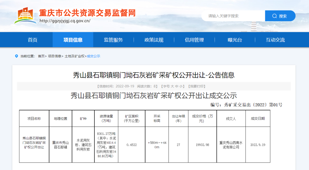 2、秀山縣石耶鎮(zhèn)銅門坳石灰?guī)r礦:成交價:1.99億元;競得人名稱:重慶秀山西南水泥有限公司;建筑石料用灰?guī)r儲量3486.80萬噸,生產(chǎn)規(guī)模300萬噸/年。