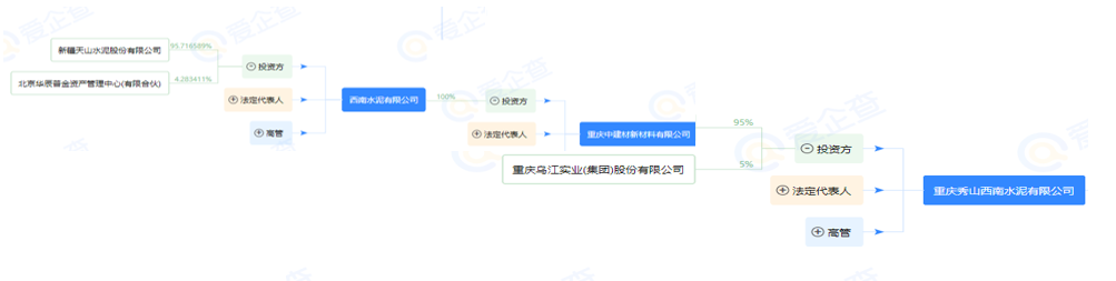 重慶秀山西南水泥有限公司由重慶中建材新材料有限公司95%控股,重慶中建材新材料有限公司由西南水泥有限公司100%控股,西南水泥有限公司由新疆天山水泥股份有限公司95%以上控股。
