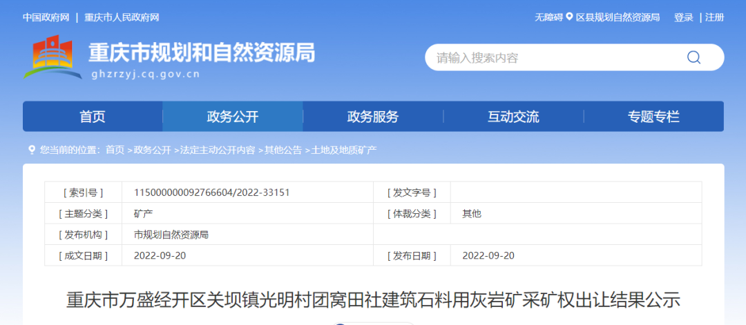 1、萬盛經(jīng)開區(qū)關壩鎮(zhèn)光明村團窩田社建筑石料用灰?guī)r礦:成交價:2.58億元;競得人名稱:陜西生態(tài)水泥股份有限公司;資源儲量:5169萬噸,生產(chǎn)規(guī)模300萬噸/年。