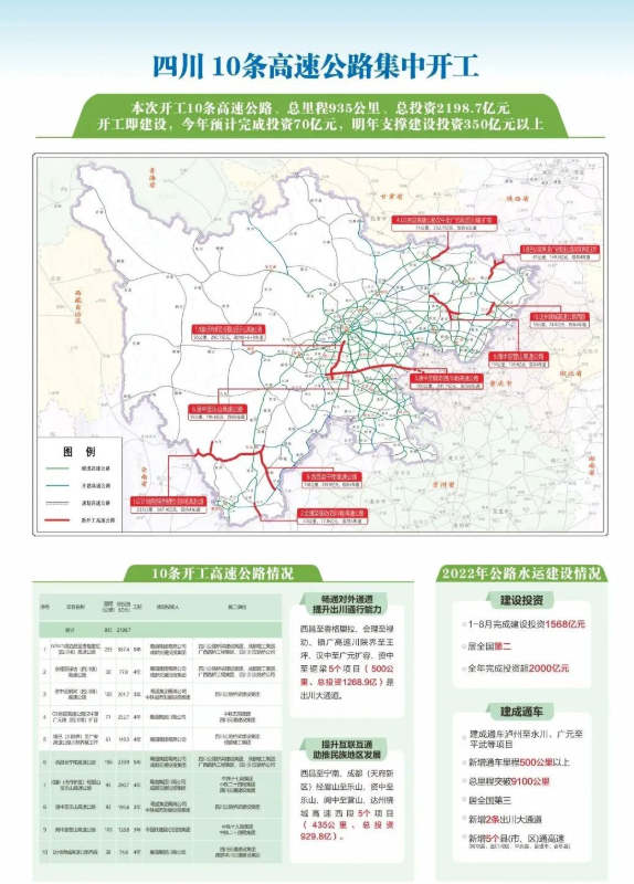 9月26日上午,四川省2022年第三季度重大項(xiàng)目現(xiàn)場(chǎng)推進(jìn)活動(dòng)在成都隆重舉行。其中,高速公路開(kāi)工項(xiàng)目10個(gè)、935公里、總投資2198.7億元,開(kāi)工高速公路項(xiàng)目數(shù)量、投資額度創(chuàng)四川交通歷次集中開(kāi)工之最。
