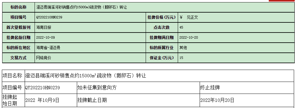 掛牌起止日期:2022 年10月9日--2022年10月20日