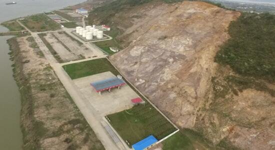 而華億石油2號山體是沿江受損山體中修復(fù)難度最大、面積最廣的一座“重癥山”,在山體的生態(tài)修復(fù)過程中,根據(jù)山體地質(zhì)情況及當(dāng)?shù)貧夂蛱攸c,采用了四季常青的復(fù)綠方案,因其坡度陡且?guī)r面光滑,新增覆土極易被雨水沖走,恢復(fù)植被難度增大,因此施工單位摒棄常規(guī)植樹種草技術(shù),采用先進的高次團粒噴薄技術(shù)進行復(fù)綠。