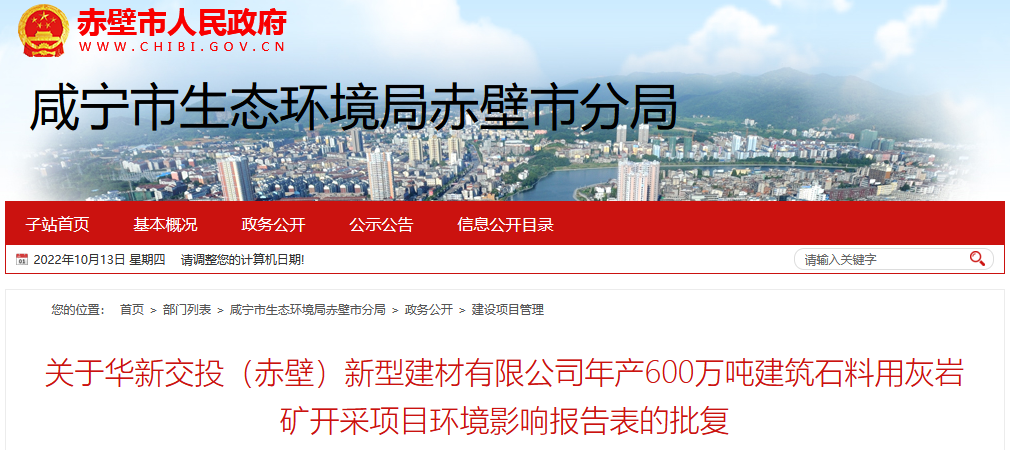 近日,湖北赤壁市人民政府批復(fù)了華新交投(赤壁)新型建材有限公司年產(chǎn)600萬噸建筑石料用灰?guī)r礦開采項目環(huán)境影響報告,該項目總投資4億元。