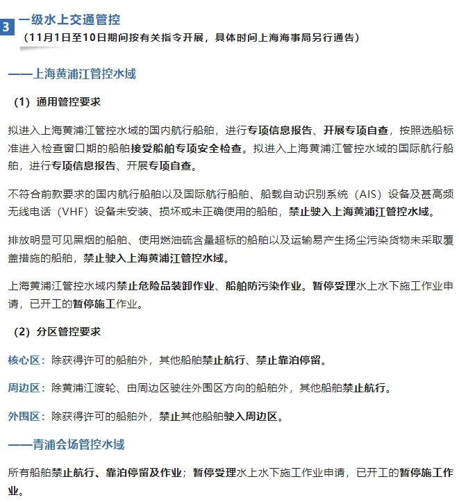 為確保第五屆中國國際進口博覽會順利舉辦,根據(jù)進博會期間上海市安保工作安排,自2022年10月21日起至11月10日間對上海相關水域?qū)嵤┧辖煌ü芸卮胧9潭ɑ蜷L期在上海黃浦江管控水域航行、停泊、作業(yè)的港內(nèi)作業(yè)船舶(包括但不限于渡輪、游覽船、游艇、保潔船、供油供水船、防污染作業(yè)船、工程船、港作拖輪)應當于10月21日前經(jīng)海事管理機構(gòu)船舶專項安全檢查通過,向海事管理機構(gòu)報備船舶和船上人員信息、停泊地點和作業(yè)水域,方可從事相關活動。