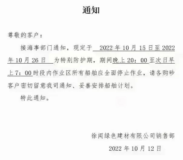 廣東省湛江市徐聞綠色建材有限公司發(fā)布《通知》,接海事部門通知,現(xiàn)定于2022年10月15日至2022年10月26日為特別防護期,期間晚上20:00至次日早上7:00時段內(nèi)作業(yè)區(qū)所有船舶應全面停止作業(yè),請各購砂客戶密切留意我司通知、妥善安排船舶計劃。