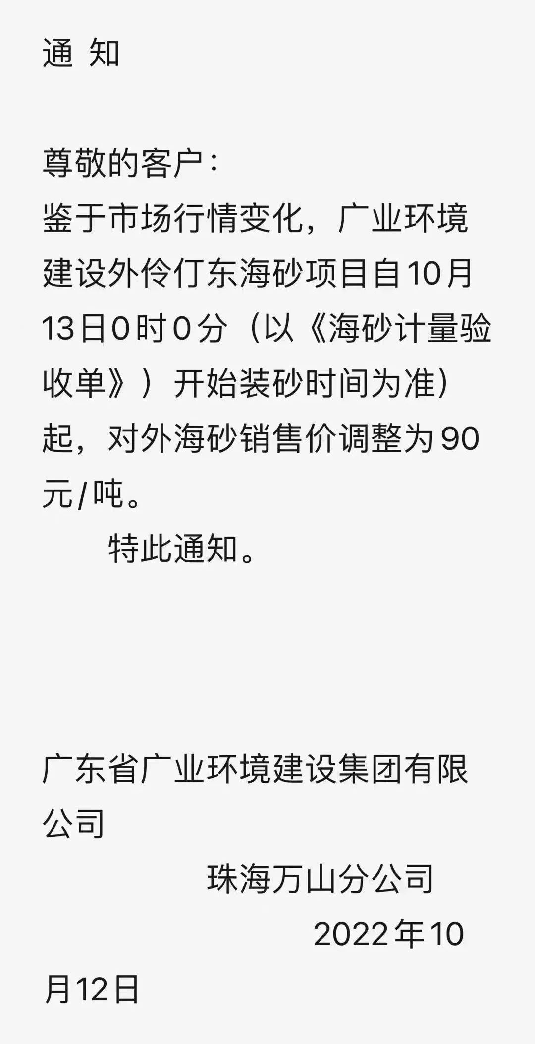 廣東省廣業(yè)環(huán)境建設集團有限公司珠海萬山分公司,近日發(fā)布《通知》,鑒于市場行情變化,廣業(yè)環(huán)境建設外伶仃東海砂