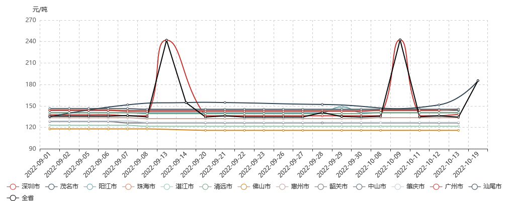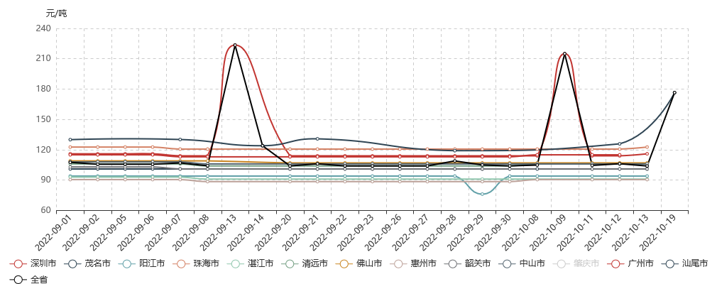 廣東全省碎石最高價223.50,最低價113.00,均價118.30;其中,深圳市價格波動較大,汕尾市碎石價格10月19日有所波動,其他區(qū)域碎石價格基本穩(wěn)定。
