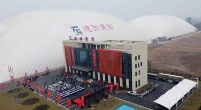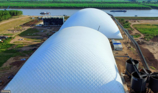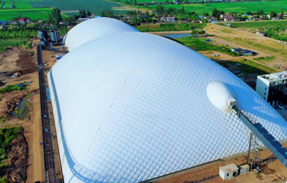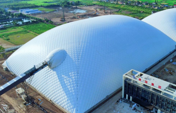 中建北域封閉式智能氣膜儲(chǔ)料棚結(jié)構(gòu)具有密閉性強(qiáng)、工期短、造價(jià)低、安全性高、使用壽命長(zhǎng)等特點(diǎn),可有效解決料倉(cāng)堆存、粉塵排放等問(wèn)題,氣膜內(nèi)部抑塵效果可達(dá)95%,運(yùn)行成本僅為同行業(yè)平均水平的1/20左右,每年每平方米平均耗電量?jī)H為3-4度電。