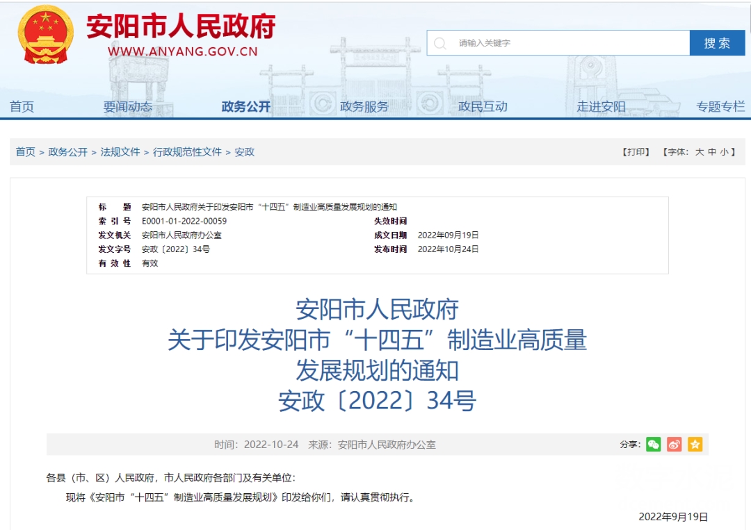 10月24日,河南省安陽(yáng)市人民政府發(fā)布《關(guān)于印發(fā)安陽(yáng)市“十四五”制造業(yè)高質(zhì)量發(fā)展規(guī)劃的通知》(安政〔2022〕34號(hào))。
