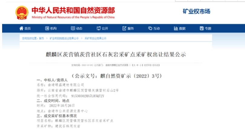 近日,曲靖碩磊建材有限公司以5501萬元成功競得麒麟?yún)^(qū)茨營鎮(zhèn)茨營社區(qū)石灰?guī)r采礦點(diǎn),采礦區(qū)資源儲(chǔ)量有3269.25萬噸。