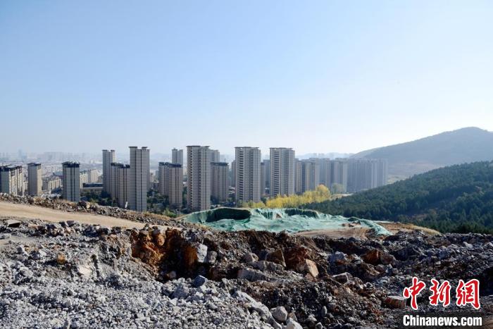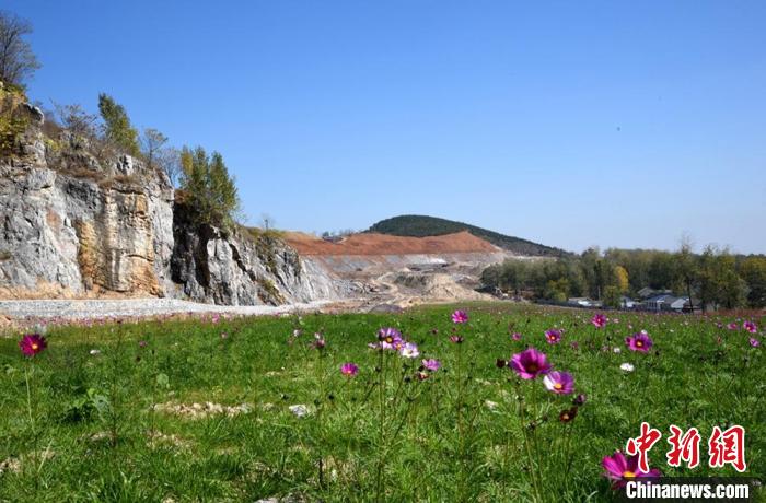 太平山生態(tài)修復項目初期建成的“花田綠海”,與遠處正在施工的現(xiàn)場形成鮮明對比。 朱志庚 攝