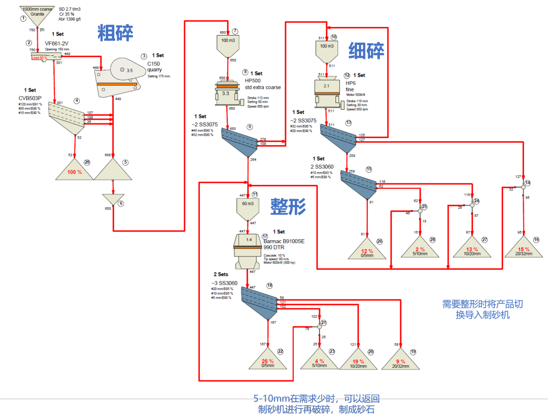 砂石骨料生產(chǎn)線(日產(chǎn)8000噸以上)一般采用三段一閉的破碎工藝,入料最大粒度在800mm-1000mm,產(chǎn)品一般包含4類:粉料、瓜米石、12#碎石和13#碎石。