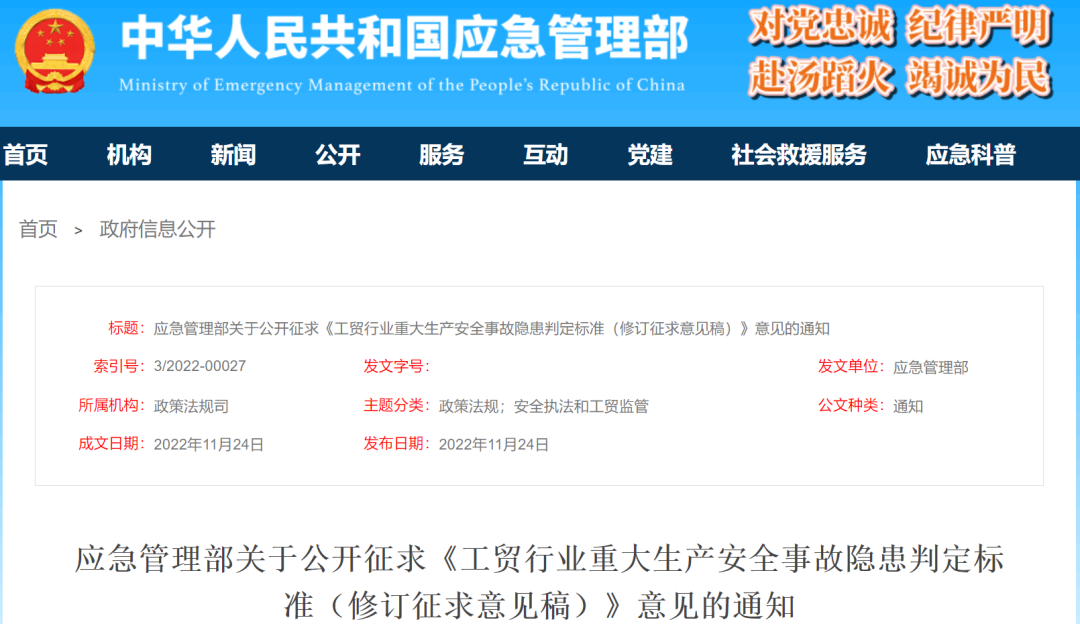 為進(jìn)一步強(qiáng)化工貿(mào)行業(yè)生產(chǎn)安全事故隱患排查治理,防范化解重大安全風(fēng)險(xiǎn),11月24日,應(yīng)急管理部發(fā)布通知,就《工貿(mào)行業(yè)重大生產(chǎn)安全事故隱患判定標(biāo)準(zhǔn)(修訂征求意見(jiàn)稿)》公開(kāi)征求意見(jiàn)。據(jù)悉,意見(jiàn)征求時(shí)間截止2022年12月23日。
