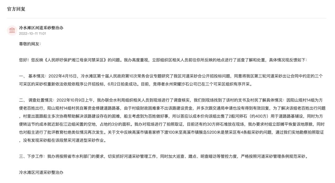 “網(wǎng)友反映的高溪市鎮(zhèn)易家橋下渡100米至高溪市鎮(zhèn)猴島5200米是禁采區(qū)有4條船采砂的問題,通過我們實地勘察拍照取證,沒有發(fā)現(xiàn)采砂船在該段禁采河道進(jìn)型采砂作業(yè)。”10月11日,冷水灘區(qū)河道采砂整治辦針對網(wǎng)友提出的問題進(jìn)行了詳細(xì)回復(fù)。