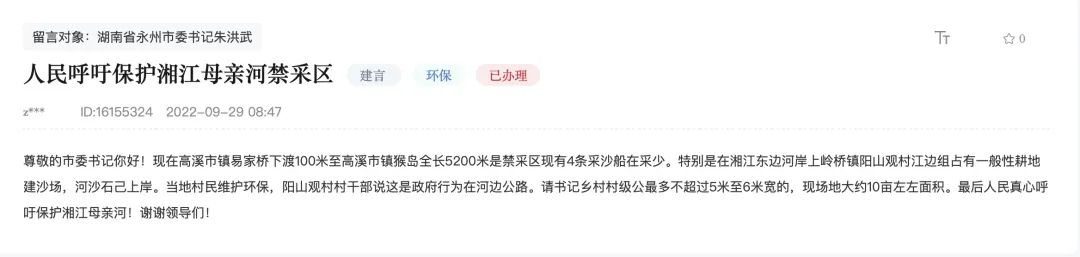 近日,湖南永州的一名網(wǎng)友在“領(lǐng)導(dǎo)留言板”留言,反映河道亂開采問題,呼吁保護(hù)湘江母親河。湖南省永州市冷水灘區(qū)河道采砂整治辦接到網(wǎng)友留言后,立即組織相關(guān)人員前往當(dāng)?shù)匮膊榱私猓⒕唧w情況在“領(lǐng)導(dǎo)留言板”上進(jìn)行反饋。