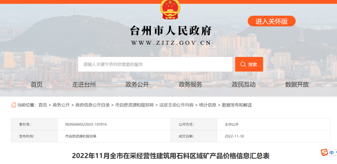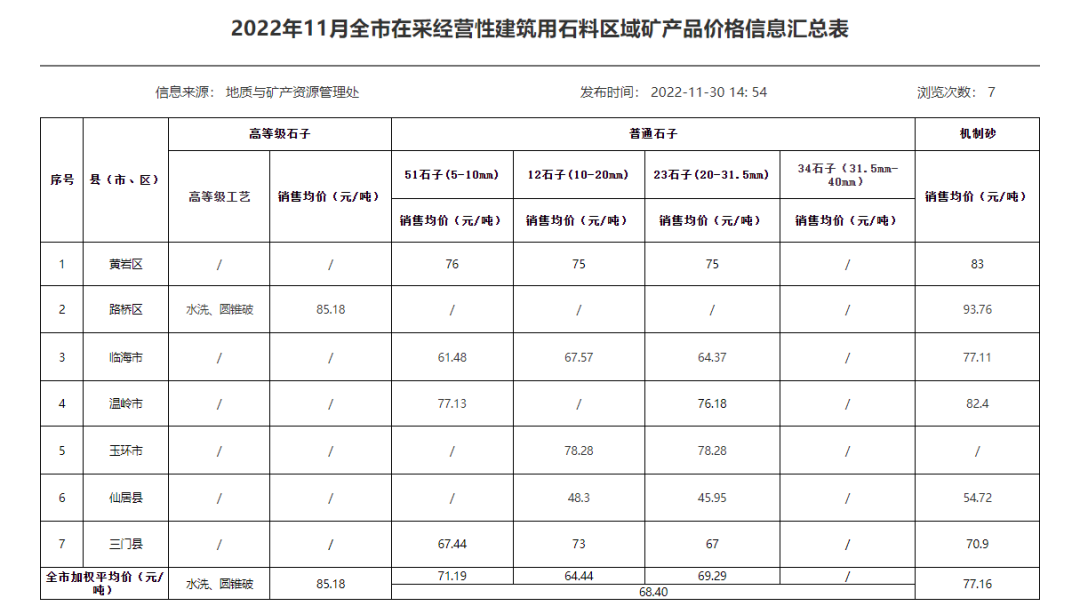 近日,浙江省臺(tái)州市人民政府發(fā)布“2022年11月全市在采經(jīng)營(yíng)性建筑用石料區(qū)域礦產(chǎn)品價(jià)格信息匯總表”中顯示,11月浙江臺(tái)州砂石均價(jià),機(jī)制砂均價(jià)77.16元/噸,精品石子均價(jià)85.18元/噸,碎石均價(jià)68.40元/噸。其中51石子(5-10mm)均價(jià)71.19元/噸,12石子(10-20mm)均價(jià)64.44元/噸,23石子(20-31.5mm)均價(jià)69.29元/噸。