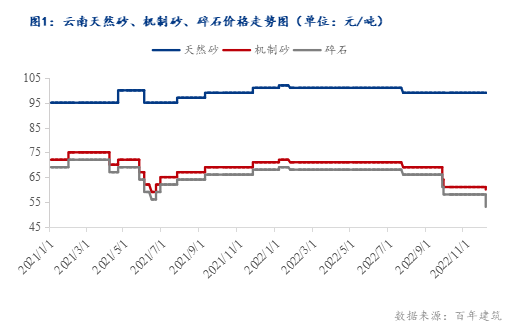 礦山基本為小礦山,年產(chǎn)能基本在30萬(wàn)噸左右,據(jù)云南某貿(mào)易商反饋,機(jī)制砂出廠價(jià)約在40-50元/噸,碎石出廠價(jià)在30-40元/噸,落實(shí)到市場(chǎng)價(jià)格層次不齊。